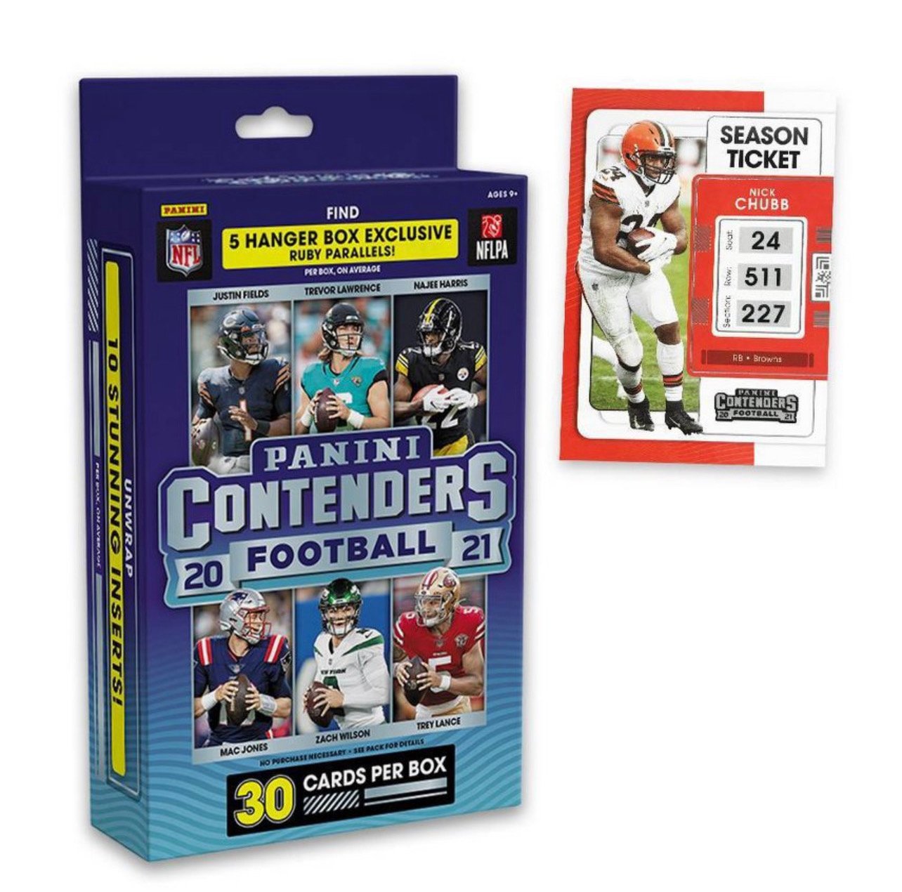 Panini presents the 2020-21 NFL Contenders hanger box! This box includes 30 cards! Each box may contain 5 hanger box exclusive Ruby Parallels! Each box may also contain 10 Stunning Inserts! Be on the look out for autographs from some of the hottest players in the NFL! Content may vary.